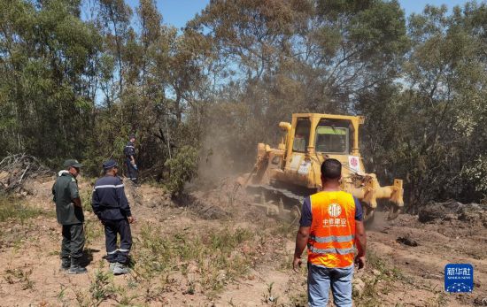 在阿尔及利亚塔夫省的山火现场,“84公里项目”工作人员用工程机械在森林中设置防火隔离带(2022年8月18日摄)。新华社发(中信建设供图)