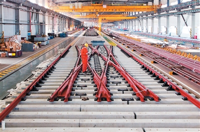 工人对出口智利的铁路道岔进行厂内试铺。 |